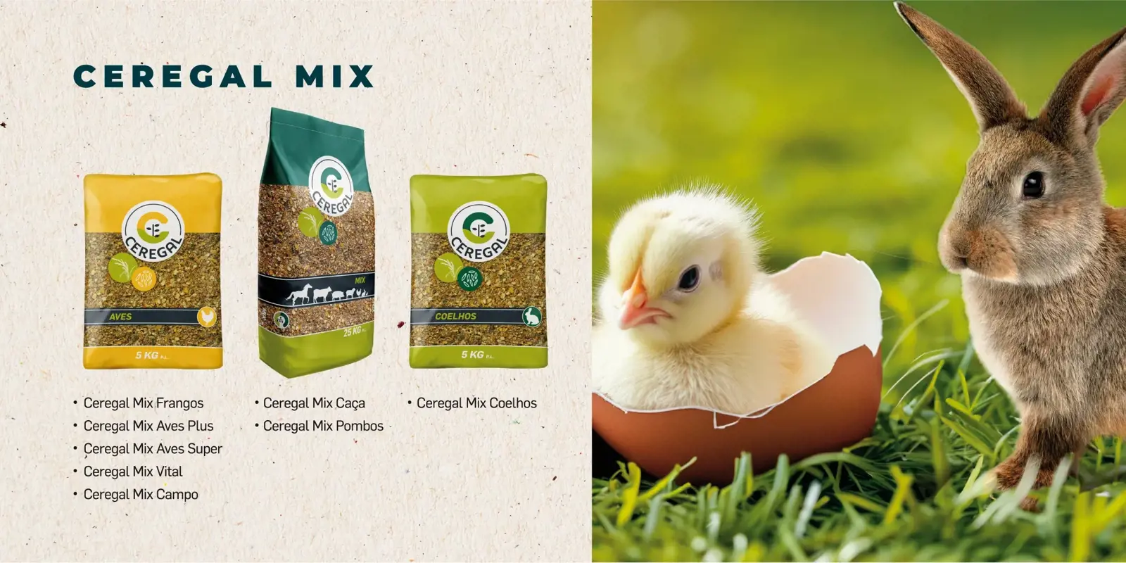 Gama de misturas de cereais para animais de capoeira, feitas a partir de grãos, sementes, milho partido e outros componentes que aportam nutrientes essenciais sob a forma de granulado.